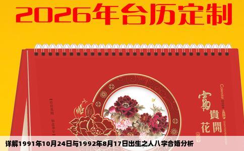 在中国的传统文化中,八字合婚是一种重要的命理分析方法,通过对男女双方出生年、月、日、时的天干地支进行排列组合,以推算两人之间的命理是否相合。本文将详细分析1991年10月24日和1992年8月17日出生之人的八字是否相合。我们需要明确两人的八字信息。1991年10月24日出生之人的八字,需根据具...
